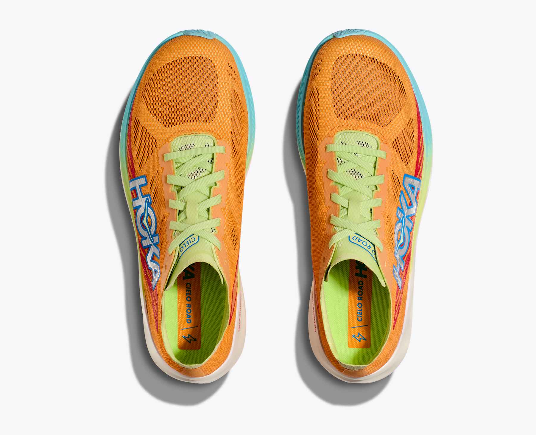 Calling all front-of-pack racers, PR-setters, and podium finishers. This one’s for you. Engineered for runners who train hard and race harder, the new Cielo Road was designed to deliver…Calling all front-of-pack racers, PR-setters, and podium finishers. This one’s for you. Engineered for runners who train hard and race harder, the new Cielo Road was designed to deliver quintessential HOKA performance that virtually disappears underfoot. A road racing flat tuned for higher tempo pickups, this ultra-light speedster features a breathable mesh upper, highly responsive PEBA foam, and built-in “chassis system” for ultimate foot lockdown.