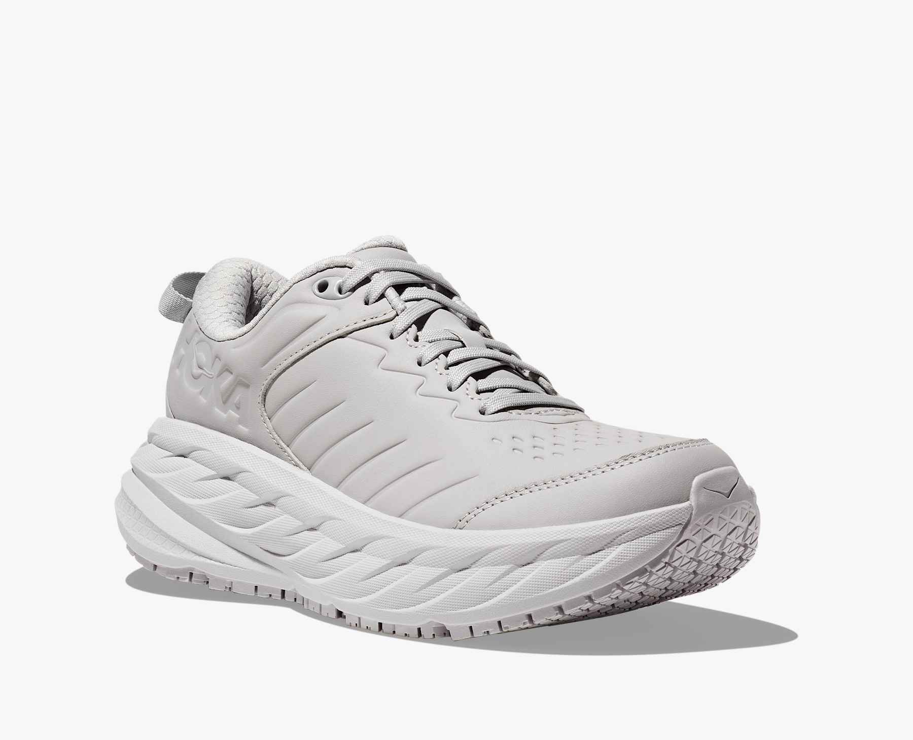 The Bondi SR takes the most cushioned shoe in the HOKA road-shoe lineup and reworks the silhouette to handle the demands of daily life. Updated with water-resistant leather, a slip-resistant outsole… The Bondi SR takes the most cushioned shoe in the HOKA road-shoe lineup and reworks the silhouette to handle the demands of daily life. Updated with water-resistant leather, a slip-resistant outsole and EVA midsole to ensure all-day cushion, this workplace warrior features an ultra-grippy, full ground contact rubber that stands up to the demands of the service industry and medical field alike.
